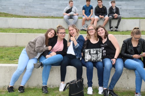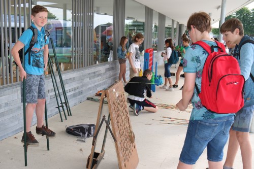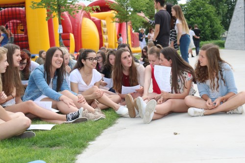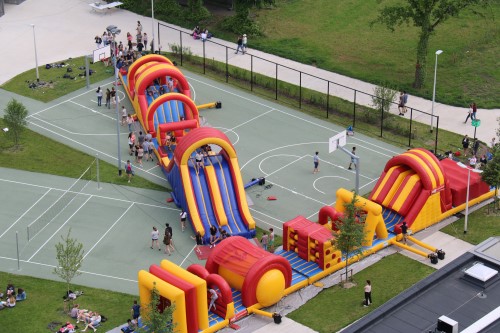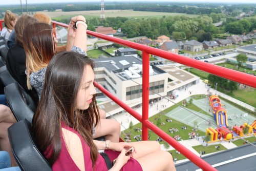Het schoolterrein leek een beetje op een festivalweide. Er klonk muziek, er waren dj’s en er werd gezongen. En de leerlingen zaten in groepjes op het gras te genieten in de zon. De campus had ook iets van een grote speeltuin met twee stormbanen en nog allerlei andere volksspelen. En sommige leerlingen waanden zich in een pretpark toen ze met de ‘sky watch’ de lucht ingingen.