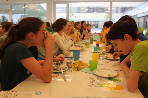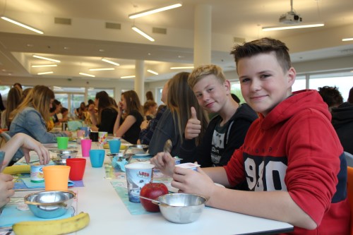 Ook dit jaar organiseerden de leerkrachten natuurwetenschappen een gezond ontbijt voor de leerlingen van het eerste jaar. “We doen dit om de kinderen te tonen hoe je, op een heel eenvoudige manier, een gezond ontbijt kan maken”, vertelt leerkracht Ester Enkels. “We merken op school immers dat er vaak niet of onvoldoende ontbeten wordt; hier laten we kijken en smaken hoe het wel kan. Hartelijk dank aan alle vakcollega’s en ook aan collega’s mevrouw Meelberghs en mevrouw Stinckens die met de leerlingen van hun klas, 3.2 en 4.2, een handje kwamen toesteken om alles klaar te zetten en weer netjes op te ruimen.”