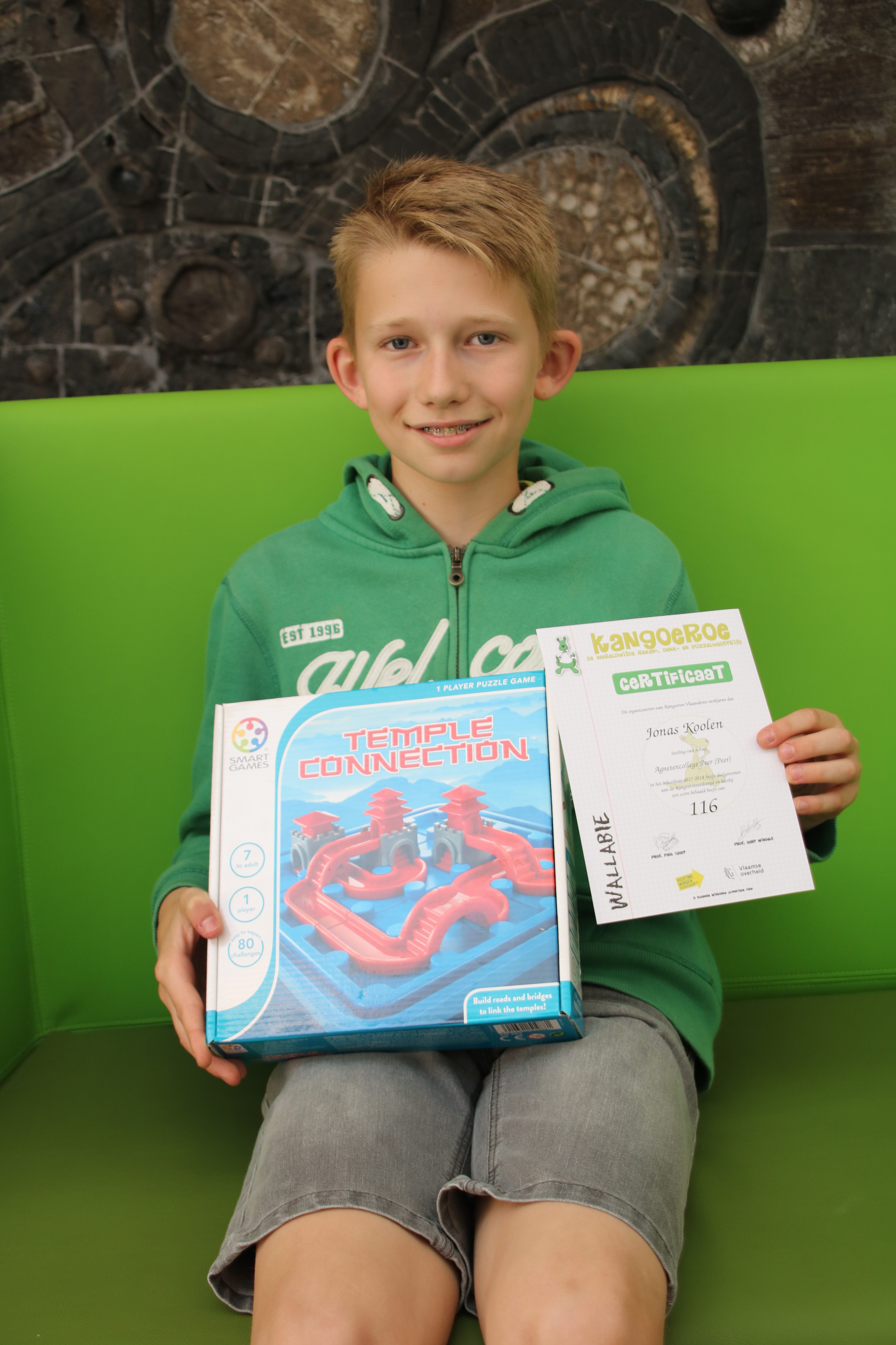 Op maandag 11 juni kreeg iedere deelnemer een certificaat met daarop het behaalde resultaat. We zijn best wel fier op de resultaten van onze leerlingen: heel wat leerlingen verdienden immers nog een extra prijs omdat ze boven het gemiddelde scoorden. Jonas Koolen uit klas 1A8 Natuur en techniek stak er bovenuit met een score van 116 op 120. Bedankt voor jullie deelname en een dikke proficiat!