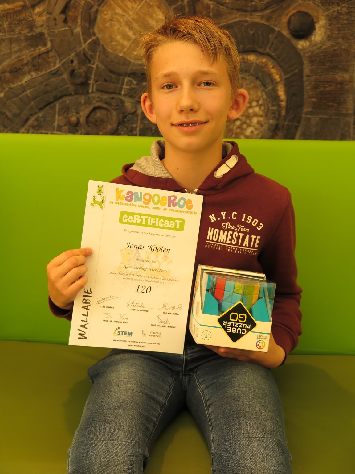 Op maandag 27 mei was het dan eindelijk zover: de prijsuitreiking. Iedere deelnemer kreeg een certificaat met daarop het behaalde resultaat. 16 van onze leerlingen wonnen een prijs. De podiumplaats gaat ook dit jaar naar Jonas Koolen uit klas 2A5. Jonas behaalde vorig jaar een score van 116/120. Dit jaar slaagde hij erin om de maximumscore te behalen. Dit doen hem er niet veel na. Slechts 26 van de 43564 deelnemers over heel Vlaanderen behalen het maximum. Proficiat, Jonas! We zijn heel fier op de resultaten van onze leerlingen. Bedankt voor jullie deelname en een dikke proficiat.