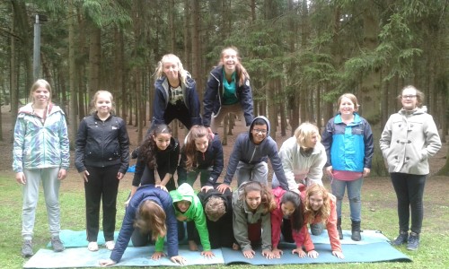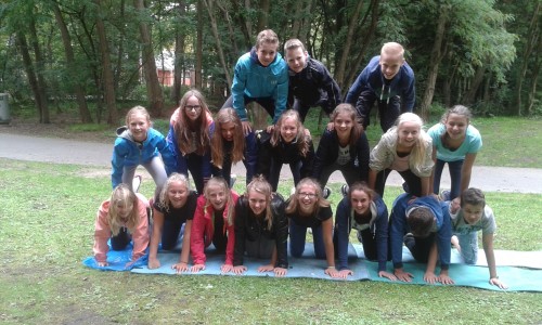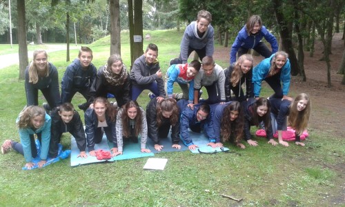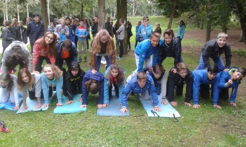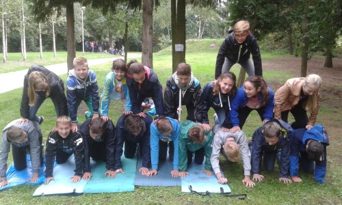 De leerlingen van het tweede jaar fietsten naar Neerpelt om in het Dommelhof allerlei groepsvormende activiteiten te doen. Een van de opdrachten die ze daar moesten uitvoeren, was een piramide maken met de klas.