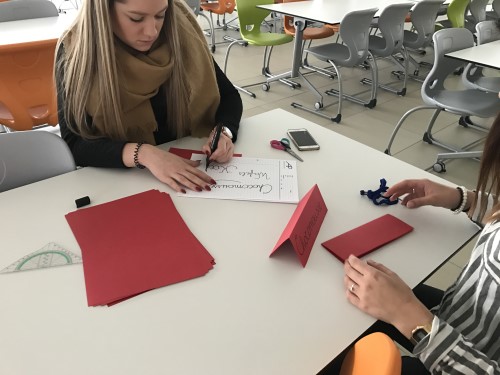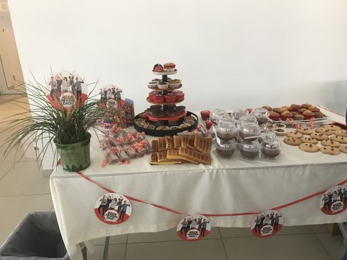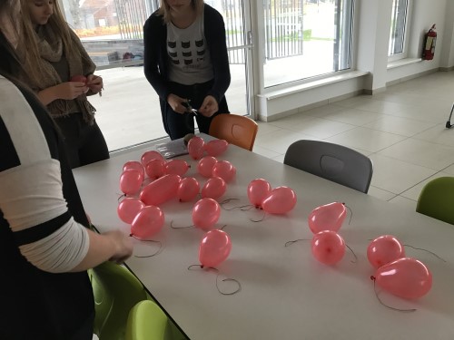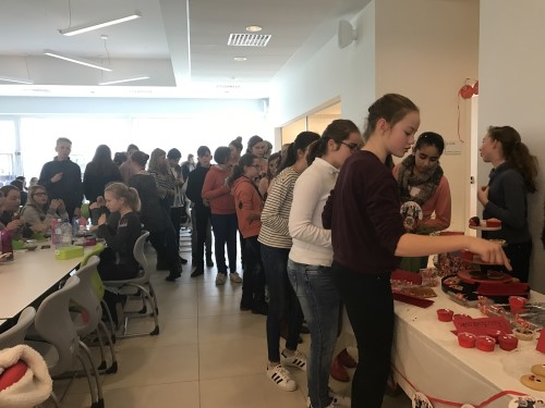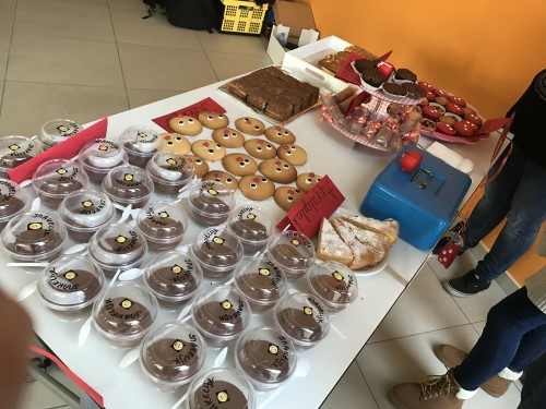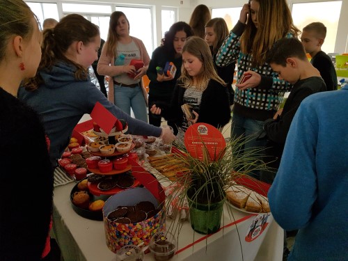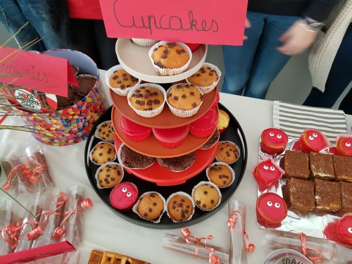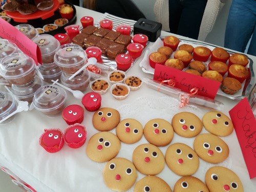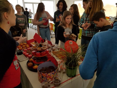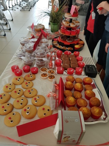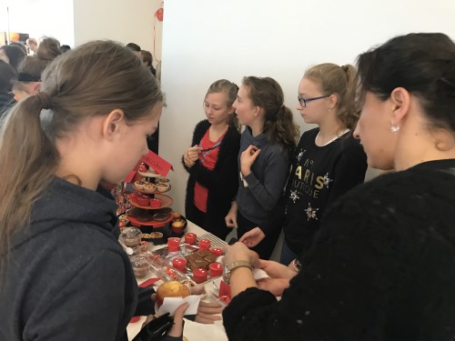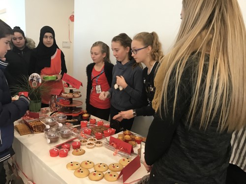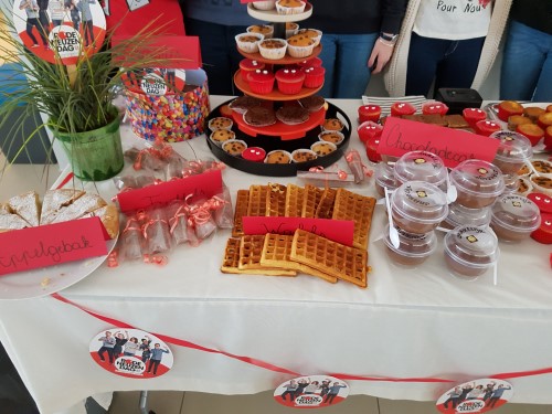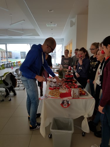 Het was een drukke ochtend voor de leerlingen van 5 C&M. Ze moesten tafels klaarzetten en rode ballonnen opblazen om iedereen die binnen zou komen in de eetzaal in de juiste sfeer te brengen. Daarna mochten de leerlingen van 1A2 hun zelfgebakken lekkernijen op twee tafels etaleren: brownies, koekjestaart, appelcake, truffels, chocomousse, truffels, cupcakes en een assortiment koekjes.