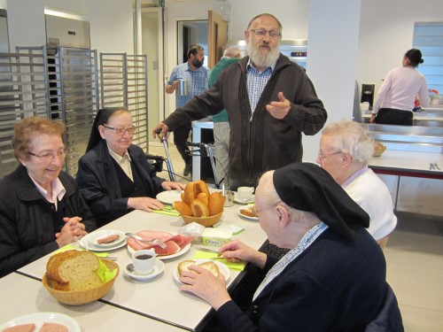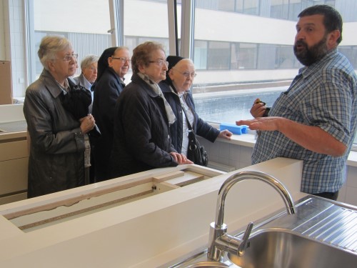 “Regen bij aankomst en regen bij het weggaan. Maar eens we binnen waren in het Agnetencollege, scheen de zon. We werden verrast door de schoonheid van de keramiek muur in de inkomhal. Het is een kunstwerk dat de Zusters destijds cadeau kregen van de aannemer en de architect van het oude Agnetendal. Maar ook de brede trappen, het vele licht en de grootte van het gebouw overrompelden ons. Ik had geen woorden maar was telkens diep onder de indruk. Ludo Vandael, Rik Schepers, Georges Meurs, Els Craeghs en Swa Lauwers gaven ons bovendien zoveel uitleg dat we er helemaal vol van waren. De hele campus komt heel creatief over, o.a. door de verschillende kleuren van het meubilair. En de keuken van het internaat is prachtig. Ik begin beter niet op te sommen want dan vergeet ik nog zo veel van alles wat er op mijn netvlies is achtergebleven… Dank aan alle mensen die hier hun beste krachten gegeven hebben om alles zo mooi en efficiënt te maken.”